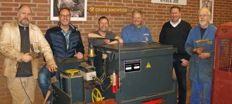 Die Mitarbeiter des Bergwerksteams Jörg Braach (links), Harald Severens, Klaus Weinbrenner (3. und 4. von links) und Arthur Groß (rechts) präsentierten die technisch und optisch überholte Lok der Grubenbahn. Bürgermeister Joachim Brenner (2. von rechts) und Bergwerkssachbearbeiter Peter Thönig (2. von links) waren beeindruckt von dem Schmuckstück freuen sich auf einen guten Saisonstart.